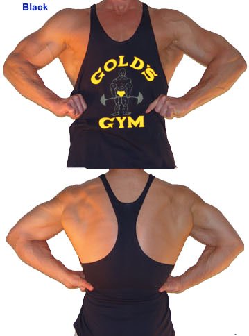 A mens y-back tank top featuring the original Golds Gym "Old Joe" logo. This muscle tank top has thin, sewn shoulder straps that won't roll-up in an uncomfortable manner. Golds Gym mens string tank tops are available in a variety of colors. Most of the tanktops are made from 100% cotton except Grey which is 90/10 cotton/poly.